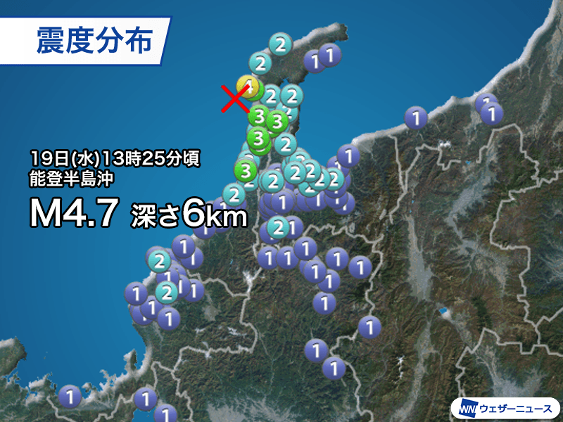 19日(水)13時25分頃、能登半島沖を震源とするマグニチュード4.7、深さ6kmと推定される地震が発生しました。この地震で石川県志賀町で最大震度4、羽咋市、かほく市、宝達志水町、中能登町で震度3の揺れを観測しています。