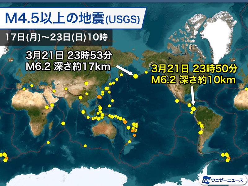 アメリカ地質調査所の解析によるマグニチュード6以上の地震は2回発生しています。最も大きな地震は中米パナマ沖とアリューシャン列島で発生したマグニチュード6.2です。この2つの地震は3分ほどの間隔で起きています。