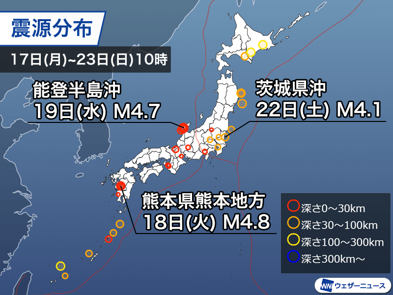昨年11月以降は石川県西方沖での地震活動が活発になっていましたが、今月15日(土)頃からは今回の震源付近で地震の回数が増え、20日(木)にはマグニチュード3.3、最大震度3の地震が起きています。21日(金)以降は活動が低調になっているものの、今後の動向には少し注意が必要です。