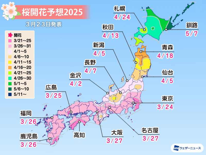 全国の桜の開花は3月23日に高知・熊本から始まり、24日には東京が続くとみています。3月中に西日本や東日本の各地で開花を迎え、4月上旬からは東北南部で咲き始め、4月下旬には桜前線が北海道に上陸します。北海道は4月22日の函館から開花が始まり、5月上旬にかけて道内各地で開花する予想です。