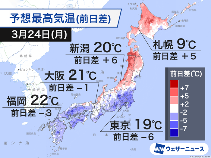 最高気温は東京では昨日より6℃下がり19℃、名古屋や大阪では21℃、福岡は22℃と予想しています。関東や中国四国、九州では昨日より気温の下がるところがほとんどで、季節先取りの暑さは落ち着きそうです。ただ、各地で20℃前後と平年のこの時期よりは高い気温で、昼間は過ごしやすい陽気となります。昨日に続いて、桜開花の便りがあるかもしれません。