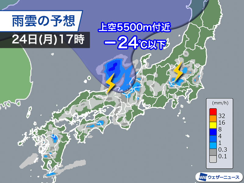週末に日本列島を覆っていた高気圧が東に移動し、西からは気圧の谷が近づいてきました。上空5500m付近で−24℃の寒気を伴っていて、周辺では大気の状態が不安定になっています。雨雲は九州にかかり始めていて、一部には発達した雨雲もみられる状況です。