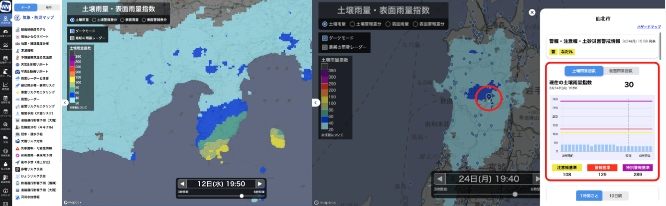 画面左上の「土壌雨量」「表面雨量」を選択すると、指数によって地図が塗られ、登録拠点をクリックすると、各地点で指数の推移が確認できます。過去分は、3時間前まで10分ごと、予測は1時間ごと6時間先までを表示します。