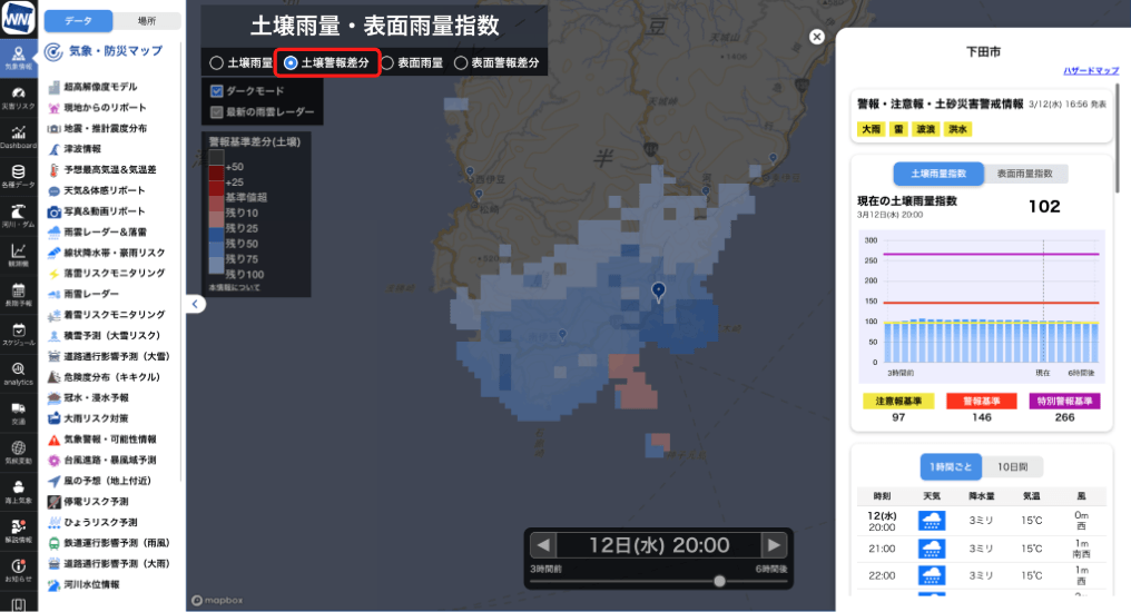 また、各メッシュごとに注意報・警報・特別警報発表にあたっての基準値が異なるため、メッシュごとの基準値と、基準値までの差を確認いただけます。