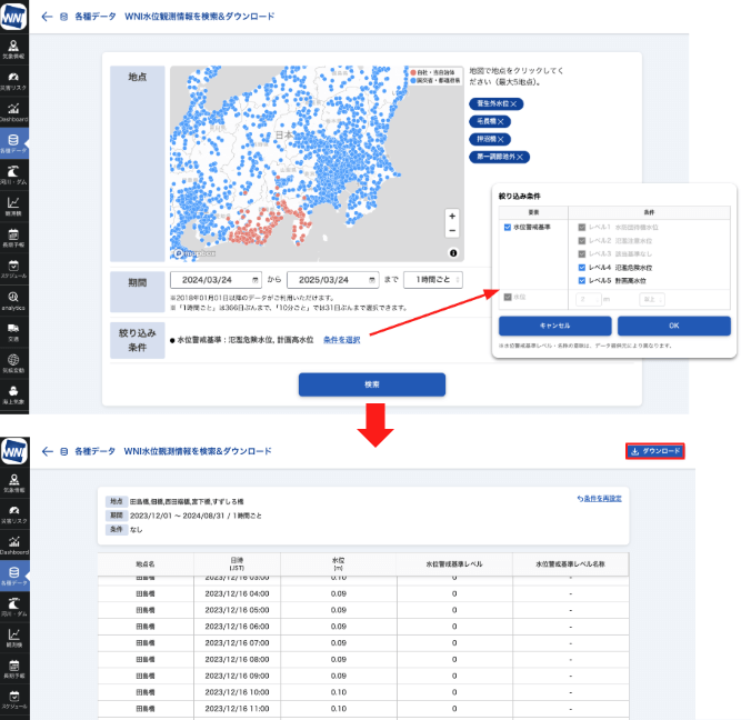 ⑤水位観測情報過去データ検索&ダウンロード