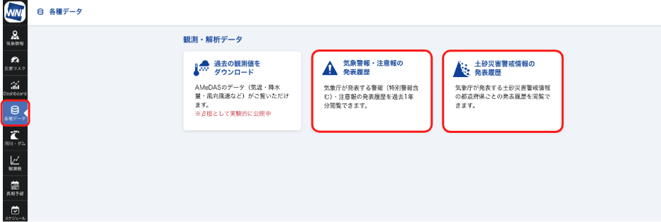 ②WNI雨量観測情報、③過去データ検索&ダウンロード