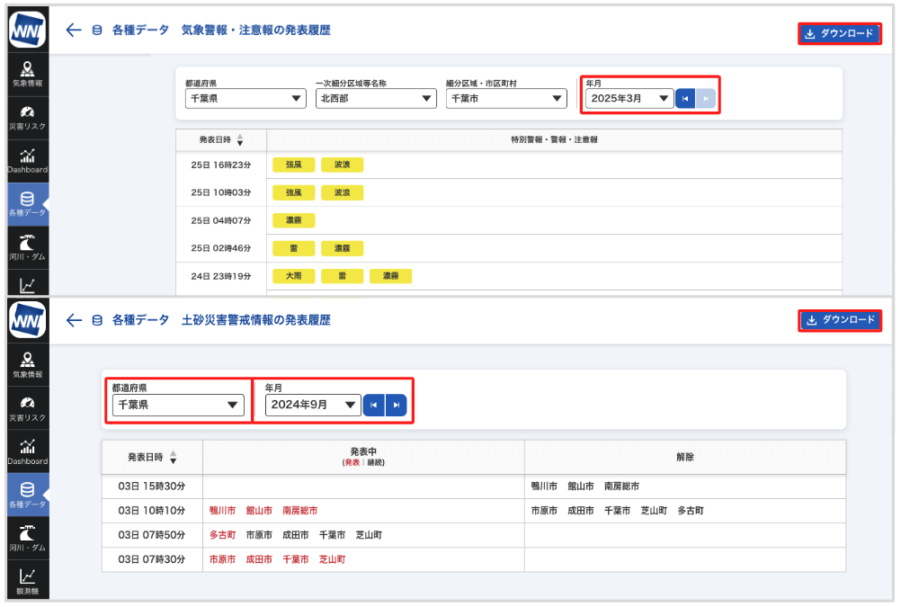 警報・注意報の履歴