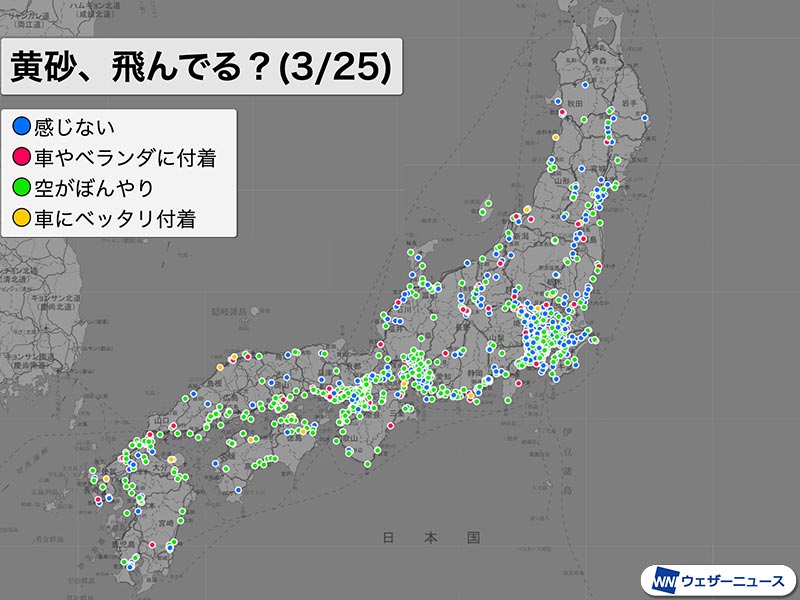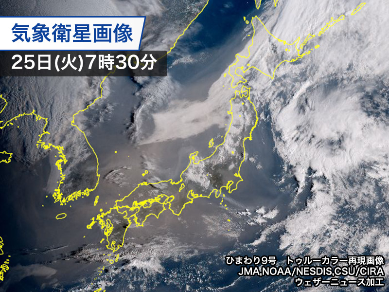 今日25日(火)は日本列島の上空に黄砂が飛来しています。九州など早い所では午前中から黄砂に覆われ、東日本や東北にも拡大する見通しです。