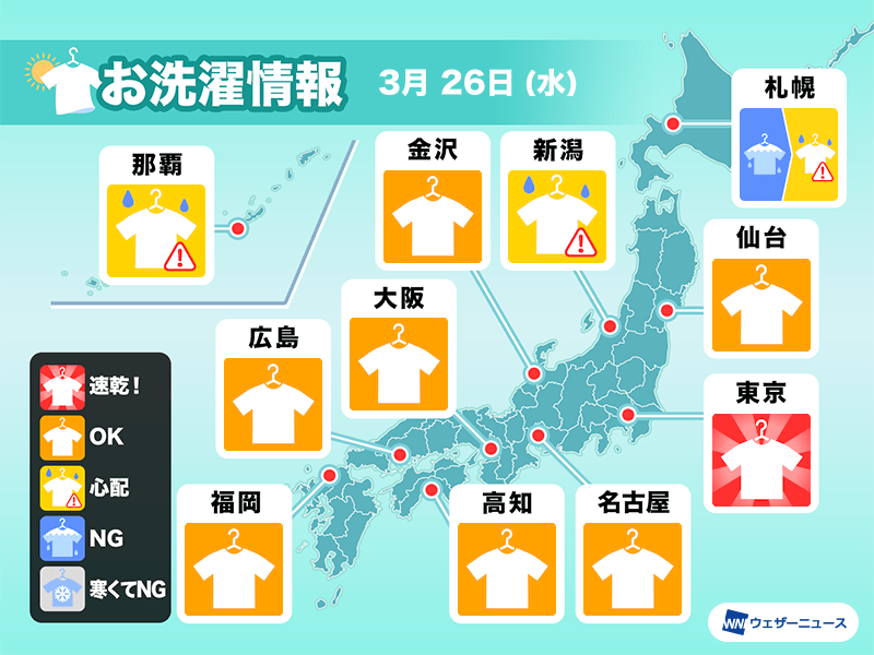 北海道や東北日本海側、北陸は低気圧や前線の影響で外干しには不向きな天気です。乾燥機などをご活用ください。