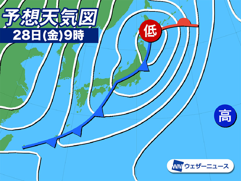 明後日27日(木)に前線を伴った低気圧が日本海に進み、発達しながら北東に進んで28日(金)の朝には北海道付近に達する見込みです。