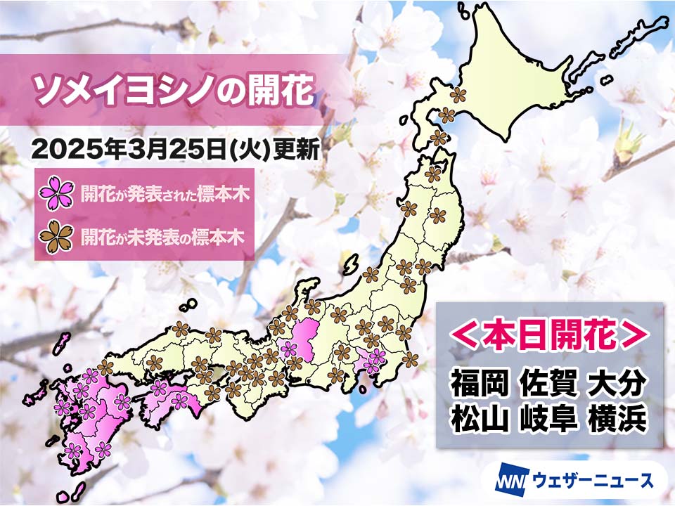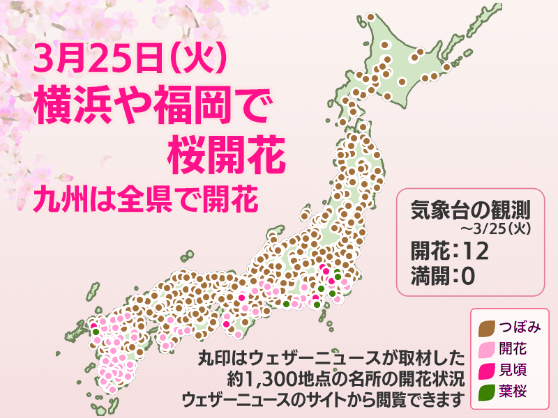 今日の桜開花状況 3月25日(火) 桜前線が福岡や横浜に 3日間で12地点開花