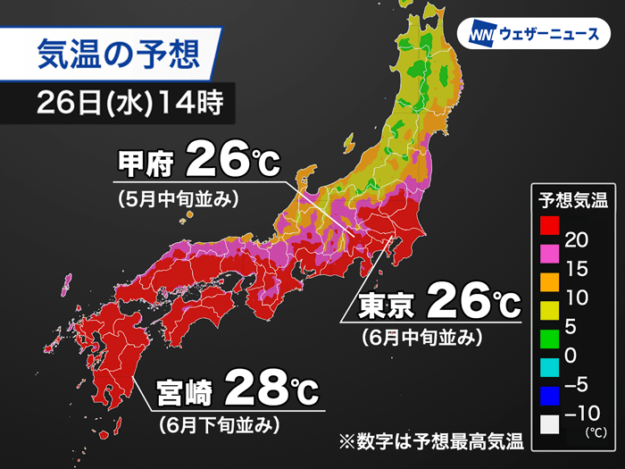 今日午後の気温予想の分布を見ると、関東から西の各地では20℃以上を示す赤色の領域のところがほとんどとなっています。最高気温は、東京で昨日に続いて夏日となる26℃と、6月中旬並みの予想です。宮崎では28℃まで上がる予想で、こちらは6月下旬並みと梅雨真っ只中の頃の気温となる見込みです。まだ体が暑さに慣れておらず、熱中症の心配も出てくるので、水分補給や屋外では日陰に入るなどの対策も忘れずに行ってっください。