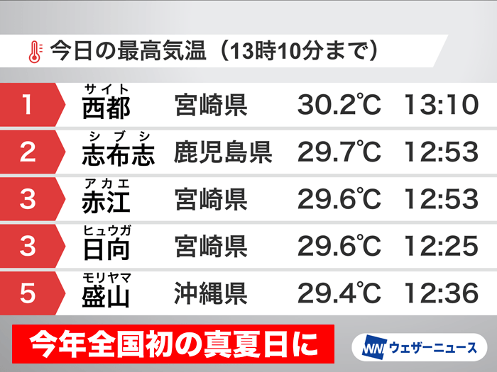 宮崎県西都で30.2℃を観測 今年全国初の真夏日に