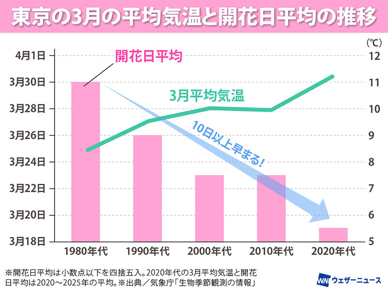 実際に東京の開花記録を見ると、3月の平均気温が上昇するにつれて開花日が早まっているのは明らかです。1980年代の10年平均は、3月30日頃の開花だったのに対して2020年代は3月19日頃と、40年で10日以上も早くなっています。