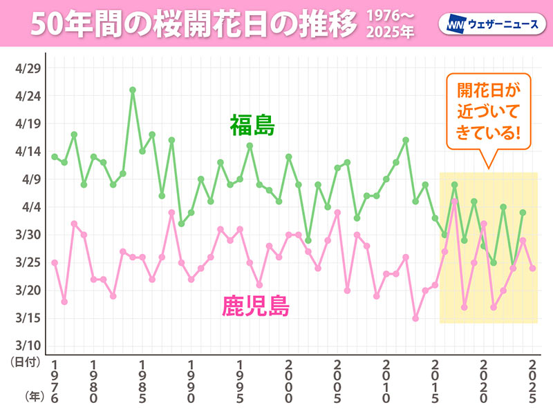 上のグラフは福島と鹿児島の50年間の開花日の推移を表したものです。福島では徐々に早まっているのに比べて、鹿児島ではあまり変化がありません。