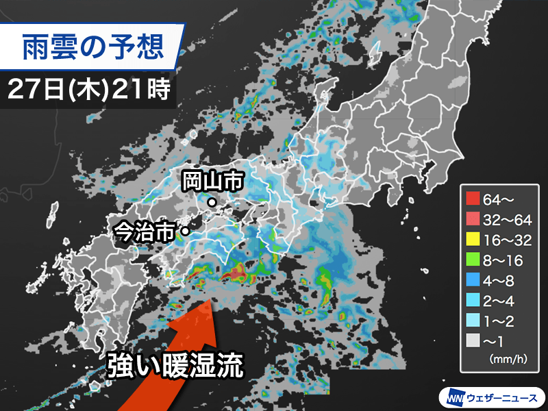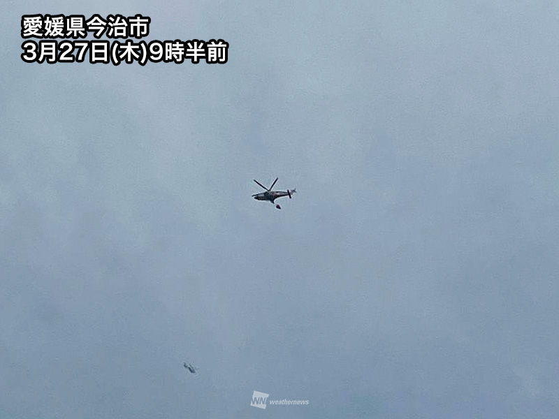 山林火災に見舞われている愛媛県今治市では昼頃、岡山県岡山市では昼過ぎに雨が降り出す予想です。