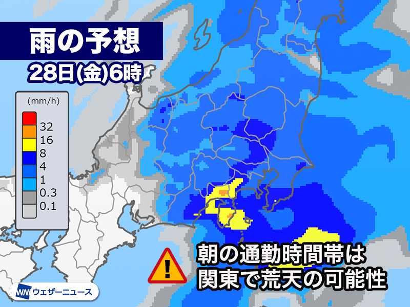 今日27日(木)に日本海に位置する低気圧は北東に進み、明日28日(金)朝には北海道付近に達する予想です。低気圧から延びる寒冷前線は東に進みながら南下し、未明から朝にかけて関東付近を通過します。
