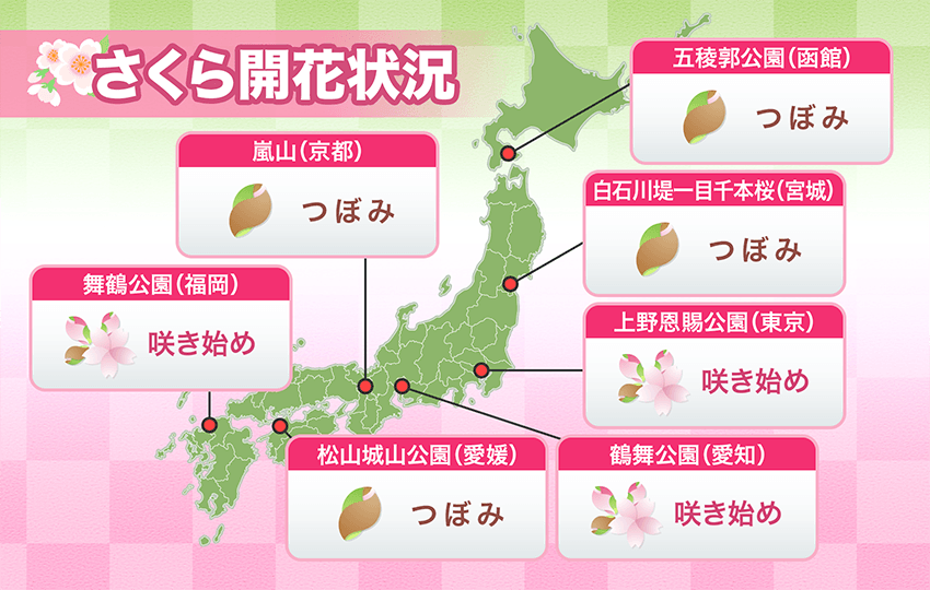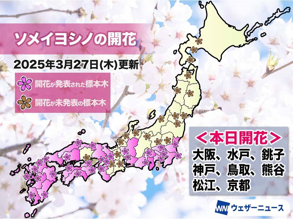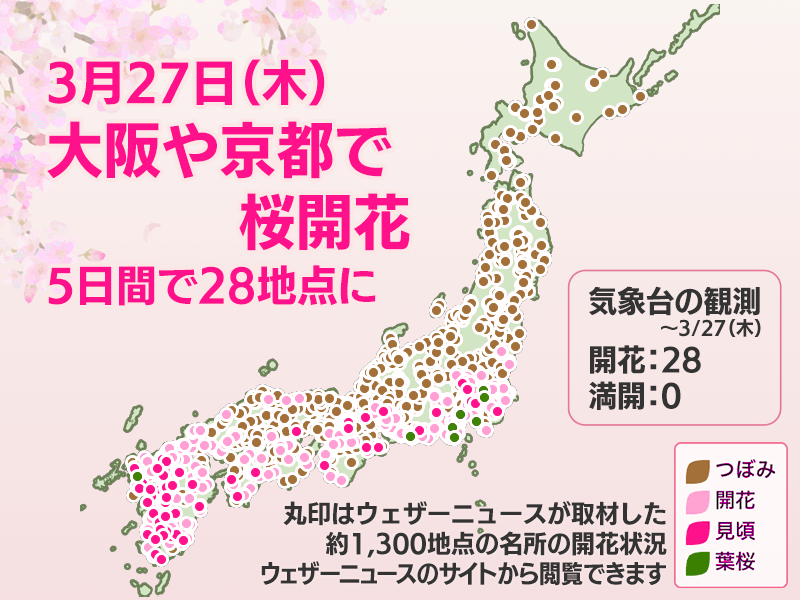 今日の桜開花状況 3月27日(木) 桜前線が大阪や京都にも 5日間で28地点開花