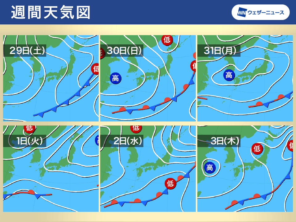 週末は移動性高気圧の圏内となる西日本や東日本を中心に晴れるところが多くなります。ただ、関東や東海は雲が発生しやすく雨の可能性があります。