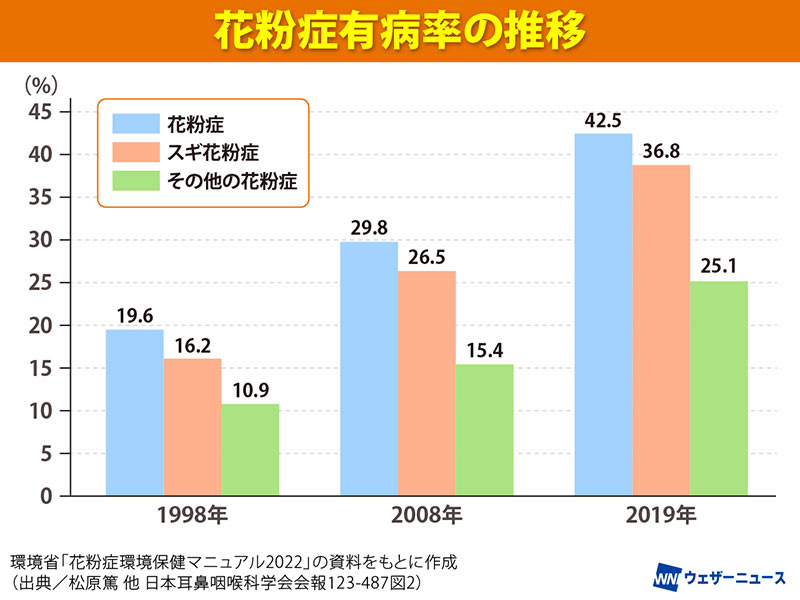 「日本の花粉症患者数は顕著に増加しています。日本ではスギやヒノキが特に戦後に多く植林されており、人口の多い関東地方や東海地方に花粉が多いことも問題です。