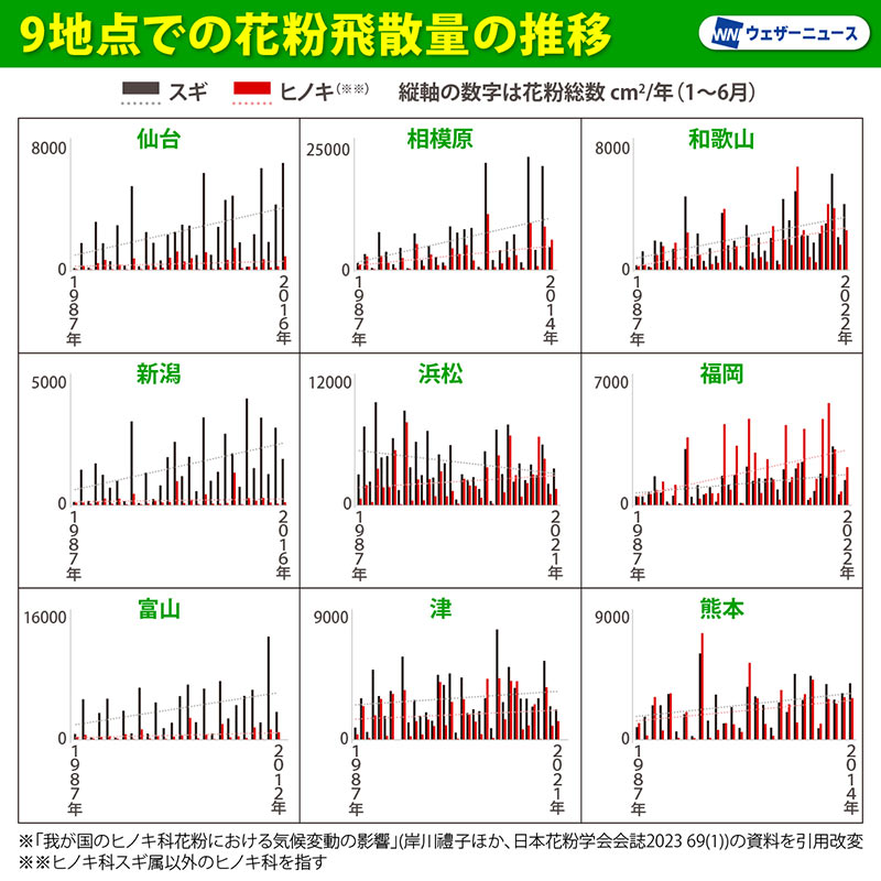 環境省「花粉症環境保健マニュアル2022」、「我が国のヒノキ科花粉における気候変動の影響」(岸川禮子ほか、日本花粉学会会誌22023 69(1))、「花粉症―花粉症は全身疾患―」(岸川禮子、日本耳鼻咽喉科免疫アレルギー感染症学会誌2022 2(4))