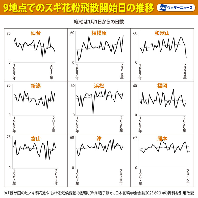 また、冬の平均気温が高くなるほど、花粉の飛散開始日が早まるという関係がみられました」(岸川先生)