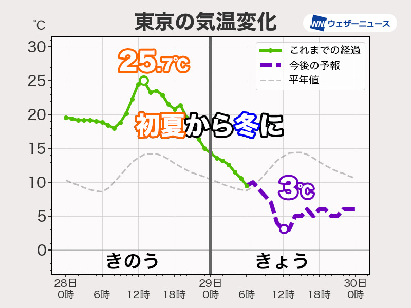 寒気が南下し、今朝の関東は冷たい雨に加えて北寄りの風が吹いています。昨日は東京都心で最高気温25.7℃を観測しましたが、その後はどんどん気温が下がっています。