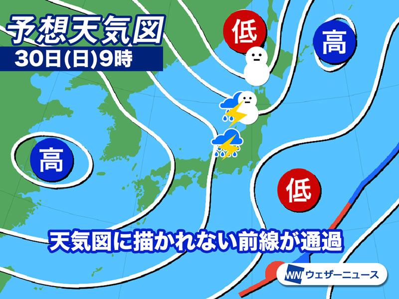 今日30日(日)は、低気圧から延びる天気図に描かれない前線が東北や北陸を通過します。