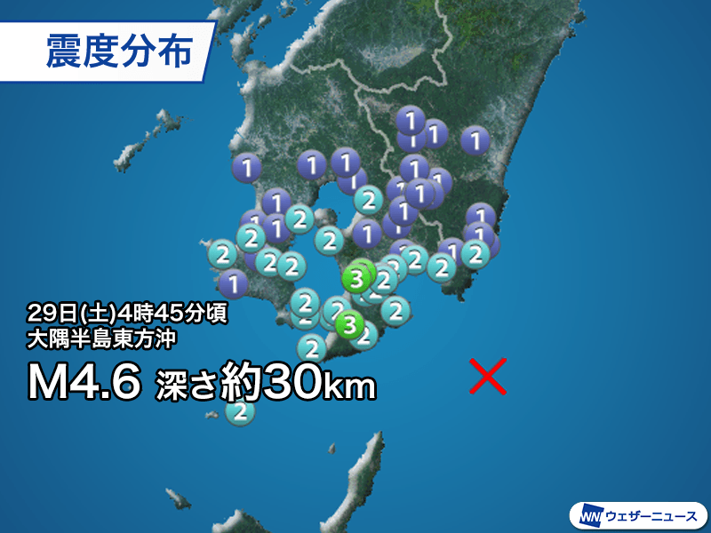 29日(土)4時45分頃、大隅半島東方沖を震源とするマグニチュード4.6、深さ約30kmと推定される地震が発生しました。この地震で鹿児島県鹿屋市、錦江町で最大震度3の揺れを観測しています。