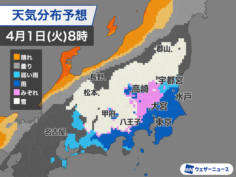 4月1日(火)の朝には雲がさらに拡大し、東海〜東北南部の広範囲で降水が予想されます。山地では雪になり、平地でも内陸の地域では雨に雪が混じるところがありそうです。甲信や北関東の山沿いなどでは一時的に積雪となるかもしれません。東京近郊では積雪などの影響はない見込みです。また、千葉県や茨城県など東関東や、東北太平洋側では雨が強まったり、雷雨となる可能性もあります。