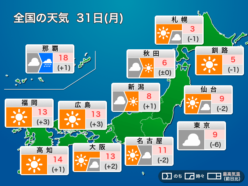 また、関東周辺では南部を中心に雲がかかりやすく、日差しはあまり見込めません。北東からの冷たい風も吹くため気温はあまり上がらず、東京都心は昨日より6℃も低い9℃までしか上がらない予想です。3月最終日となりますが、まだ冬の装いで手袋やマフラーが重宝しそうです。暖かい服装でおでかけください。