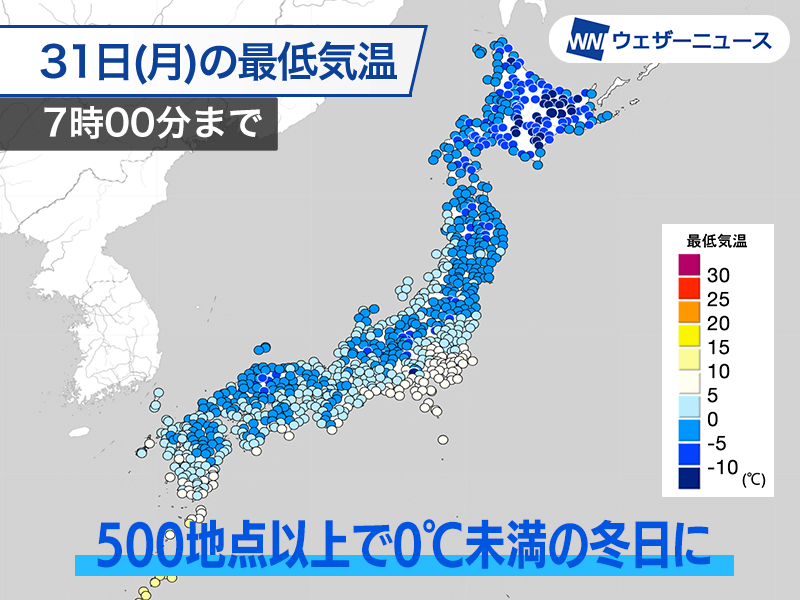 今朝は各地で冷え込み強まる 500地点以上で0℃未満の冬日に