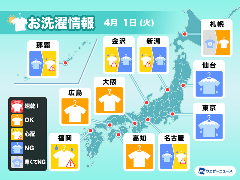 新年度スタートは、東日本や、東北南部では雨や雪で洗濯物は部屋干し推奨です。東北北部はだんだん雲が広がり午後は雨や雪が心配なので、外出する場合は部屋干しの方が安心です。九州南部も雨が降りやすくなります。