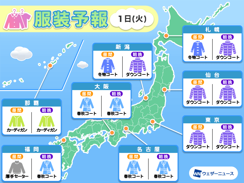 今日と明日の気温変化を比較して、気温に適した服装をご提案します。ウェザーニュースの服装予報もご活用ください。