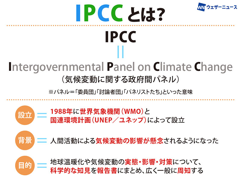 IPCCは「Intergovernmental Panel on Climate Change」の略で、「気候変動に関する政府間パネル」と訳されています。人間活動による気候変化の影響が懸念されるようになったことから、1988年に世界気象機関(WMO)と国連環境計画(UNEP/ユネップ)によって設立されました。