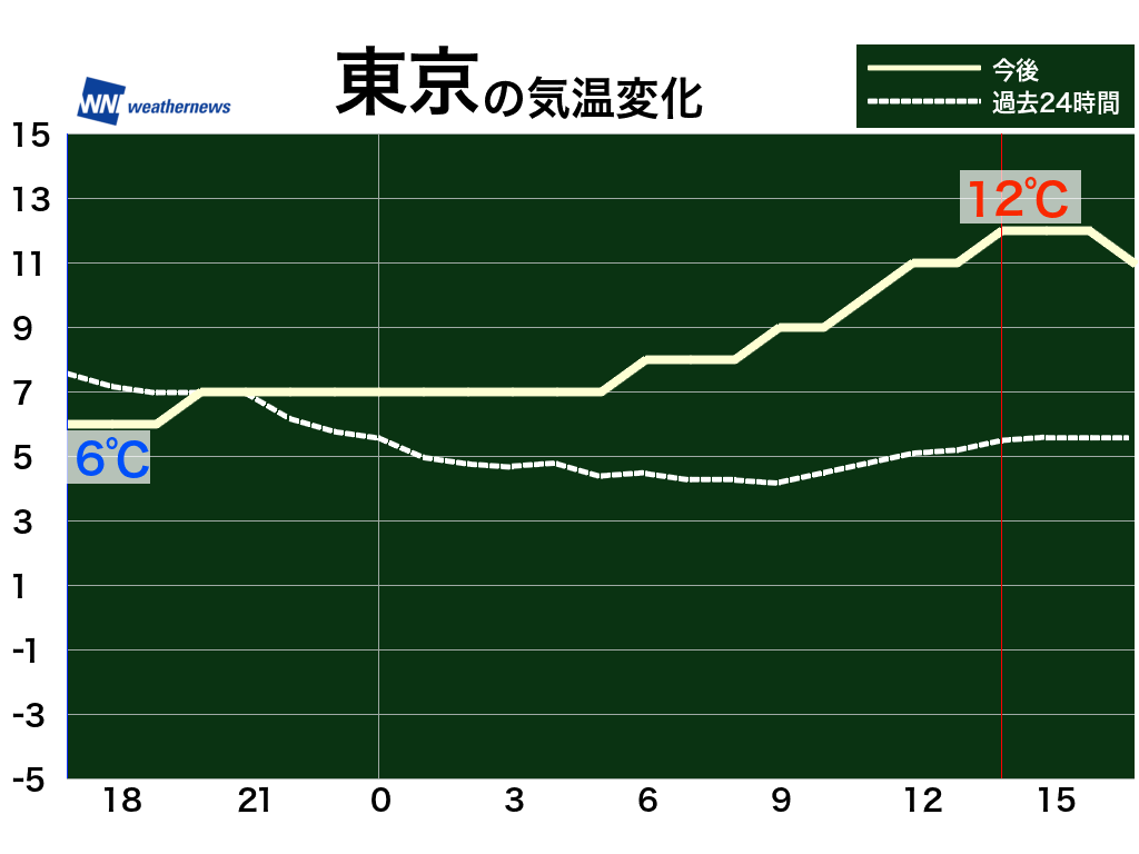朝はまだ寒さが優勢です。昼間は今日より気温が上がり、日なたでは過ごしやすい体感になります。