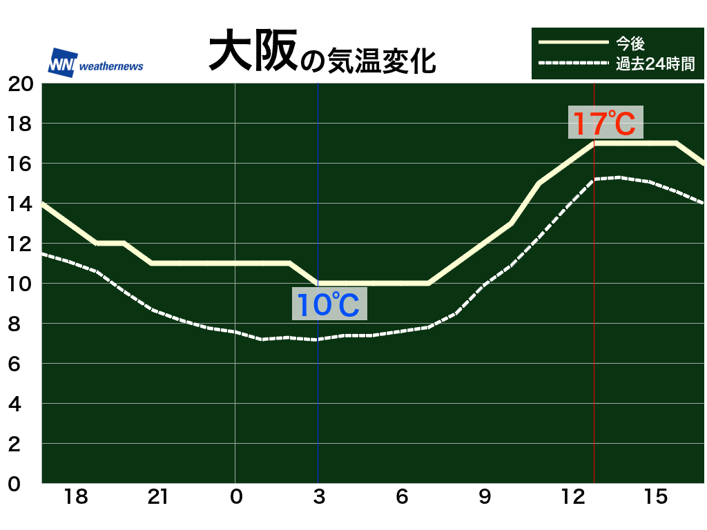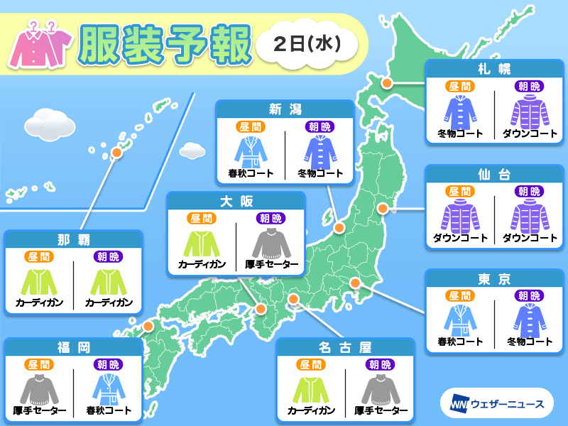 今日と明日の気温変化を比較して、気温に適した服装をご提案します。ウェザーニュースの服装予報もご活用ください。