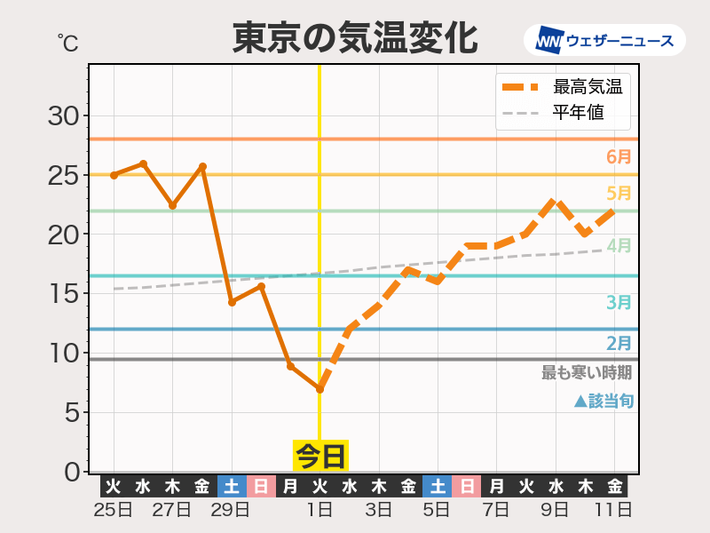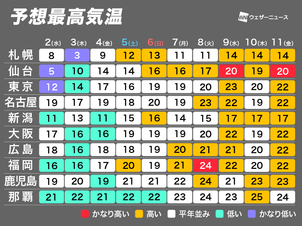 朝晩と昼間の寒暖差は大きくなりますので、服装で上手に体感温度を調節してください。また、夏日が続いた先週から一気に冬の寒さが戻った今週、再び春本番の陽気になる来週と、日々の気温変化も非常に大きくなります。体調管理に注意が必要です。