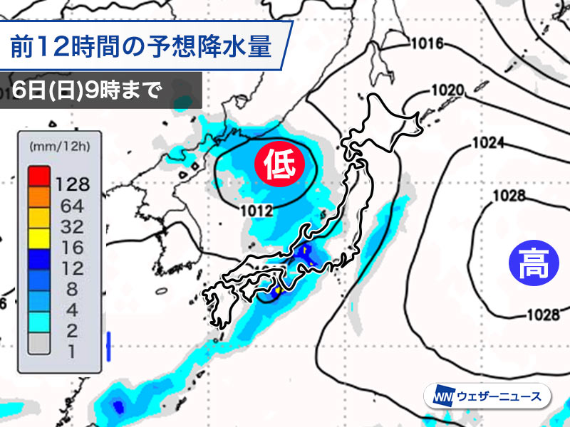 5日(土)から6日(日)にかけて朝鮮半島付近で発生した低気圧が日本海を北東に進みます。低気圧から延びる前線が日本列島を通過して広い範囲で雨が降る予想です。