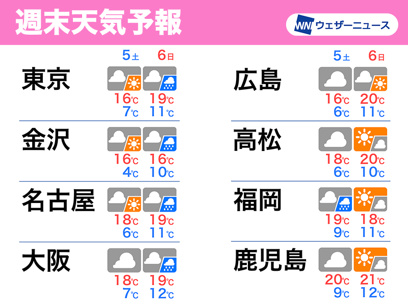6日(日)は前線が通過して東日本や近畿を中心に雨を降らせるとみています。一方、前線が通過した中四国や九州では天気が回復して日差しが届く予想。お花見にも問題ない天気となる見通しです。