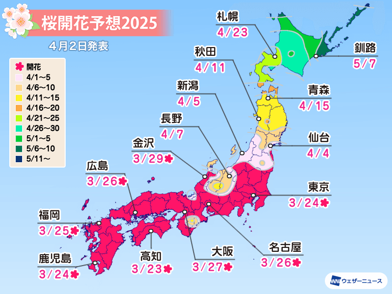 来週は全国的に気温が上昇し、北日本でも桜のつぼみの成長が急速に進む見通しです。東北や北海道の桜は平年よりも早まる所が多くなりますので、お花見の計画は早めに進めた方が良いかもしれません。