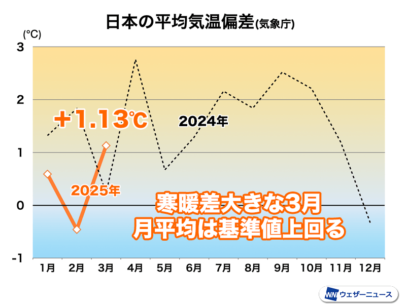 都市化の影響が比較的小さい全国15か所の代表地点(※)の観測値による、3月の日本の平均気温偏差は+1.13℃でした。昨年2024年(+0.23℃)よりも高く、1898年の統計開始以来、7番目の高さになっています。3月の気温が基準値を上回るのは8年連続です。