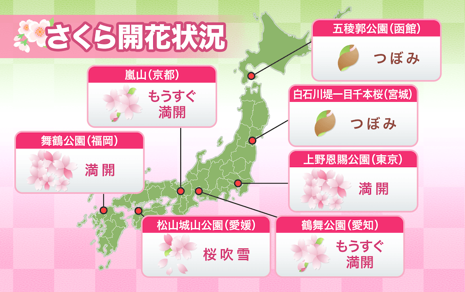 今日の桜開花状況 4月3日(木) 静岡と高松で桜満開 新たな開花は発表はなし