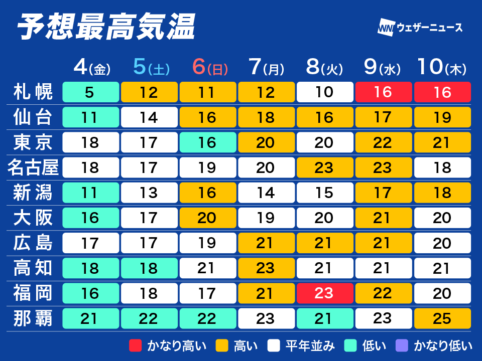 また、今週と来週の寒暖差が大きくなるため、体調を崩さないよう注意が必要です。