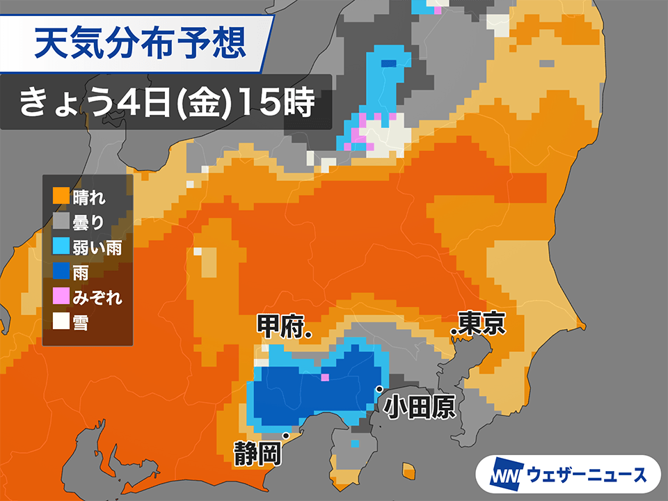 ただ、昼頃から神奈川県西部〜静岡県東部付近で雨雲が発生し、夜にかけて関東西部や南部でにわか雨の可能性がありますのでご注意ください。