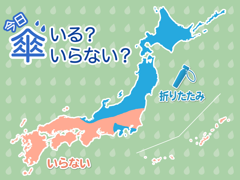 今日は大きい傘が必要なほど本降りの雨が長い時間降り続く所はなさそうです。ただ、北海道の道東は風が強いため、状況次第では丈夫な傘のほうが良さそうです。