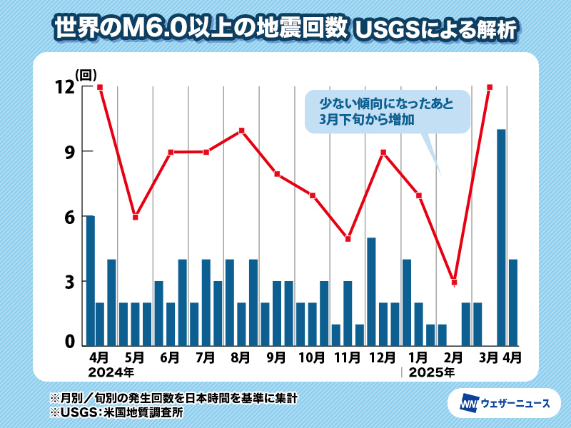 アメリカ地質調査所(USGS)の解析によると、3月下旬からマグニチュード6以上の地震が多く発生しています。3月下旬は28日にミャンマーで発生したマグニチュード7.7を筆頭に10回、4月に入ってからも日本時間の今朝発生したパプアニューギニア近海の地震を含め、すでに4回起きました。