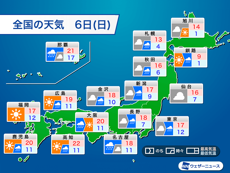 明日6日(日)は雨上がりで天気が回復する西日本で気温が上がります。特に太平洋側で高く、最高気温は高知市で22℃、鹿児島市や大阪市は20℃の予想です。