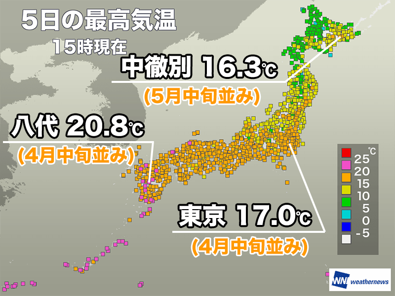 15時までの最高気温は熊本県八代市で20.8℃、島根県益田市で20.2℃を観測。福岡市も19.7℃まで上がって、4月中旬並みの陽気です。関東は昨日に比べると若干低いものの、東京都心で17.0℃とこの時期らしい暖かさになっています。