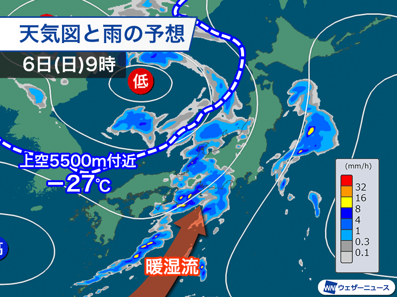 上空に寒気を伴った低気圧が日本海に進み、日本付近を気圧の谷が通過していきます。西日本では今夜にかけて次第に雨が降り出し、一時的に雨の強まる所がある見込みです。